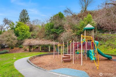 Very spacious and private. This corner unit has no shared walls! Very quiet. Unique for a condominium unit. Great Queen Anne location enjoying impressive sunrises from the unit and secluded deck. Enjoy the adjacent charming Bhy Kracke Park. Quiet, dead-end road with ample parking for guests. Floor plan is well designed with an open Living Room and a full Dining Room layout. This unit features a large open kitchen concept. Gas fireplace, electric blinds in the living room / black out blinds in the bedrooms, five-piece master suite bathroom with an extra-large walk-in closet. Large storage unit, and two parking spaces. Amazing location and close to Seattle center and Upper Queen Anne amenities with cafes, restaurants, shops. Minutes to Amazon, Facebook, Expedia and the Space Needle. Very Walkable, Very Bike-able and Excellent Transit!
