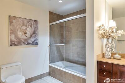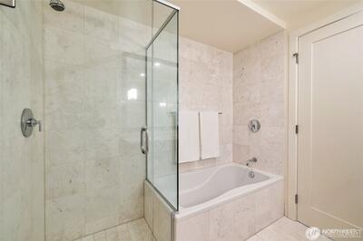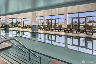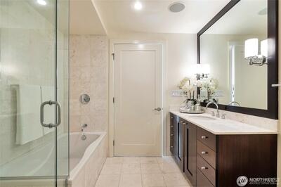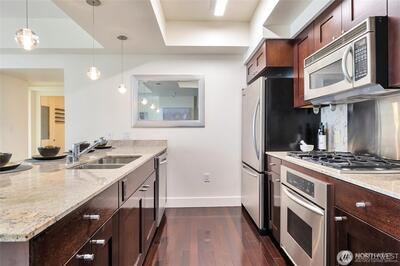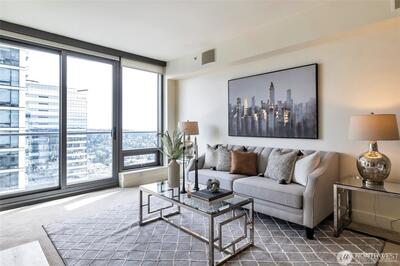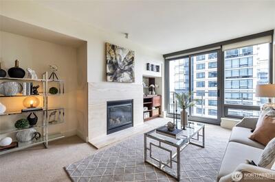 Discover the best of Bellevue from this luxurious 33rd floor condo with a view to Meydenbauer Bay! Its great room layout is flooded with light and scenery from full-length windows. Cooks will appreciate the open kitchen with slab granite surfaces, stainless-steel appliances, stylish pendant lighting, and sizeable breakfast bar. Step from the inviting fireside living area to your private balcony overlooking Bellevue Downtown Park and the bay beyond. A bay view primary suite with marble bath, walk-in closet & balcony access, plus a 2nd view bedroom, 2nd full bath, and den complete this just right-layout. Your two garage parking spaces and private storage are just an elevator ride away. Stroll to the park and world-class dining and shopping.