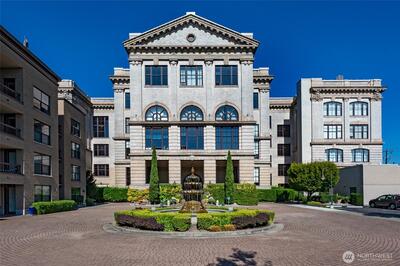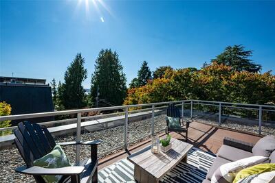 Stunning & light filled top floor townhome style condo perched perfectly w/in the Queen Anne High School Industrial Arts Bldg, a true mid-century modern gem. Breathtaking windows in the lofted main flood the space w/westerly light & leafy green views. Open kitchen, dining, living + 1/2 bath make for an entertainer’s dream. Upstairs: 2 spacious & bright bedrooms, full bath, large closets, full-size laundry & a SPECTACULAR 400 sq ft wraparound deck w/sweeping territorial, mountain & sound VIEWS for yr-round indoor-outdoor living. TWO secure garage spots + storage unit complete this home. Steps to Queen Anne’s shopping, dining & parks w/easy access to SLU. No rental cap & pets OK. Perfect full-time residence or peaceful in-city pied-à-terre.