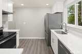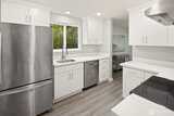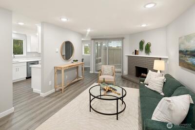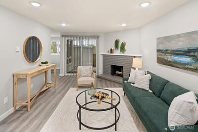 Step into this beautifully updated, move-in ready ground-floor end unit condo—light, bright, and full of charm! The stylish kitchen shines with sleek quartz counters and stainless-steel appliances, opening to a welcoming family room with a cozy wood-burning fireplace. Slide open the doors to your private patio and soak in the peaceful outdoor space! Newly installed LVP floors flow throughout, leading you to two inviting bedrooms with custom closet systems and oversized windows that bring the outdoors in. An updated bath, full-size washer and dryer, two storage rooms, and a covered garage space add comfort and convenience. Plus, the building includes an elevator and boasts undeniable curb appeal.