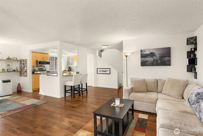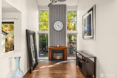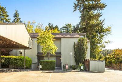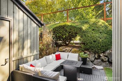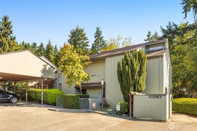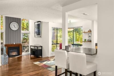 Beautiful NW Contemporary townhouse end unit in Yarrowood! Prime location near Seattle, DT Bellevue, Redmond & Kirkland. Vaulted ceilings and large windows offer tons of natural light and views of mature landscaping. The great room features hardwood floors, a wood-burning fireplace and an open floor plan that leads to a beautiful private patio—perfect for enjoying PNW evenings. Upstairs offers 2 bedrooms, full bath, and a laundry room. Just steps from the pool, tennis court & clubhouse. Includes 2 parking spaces, extra storage, and no rental cap!