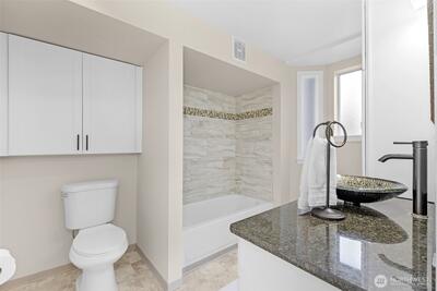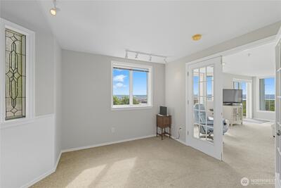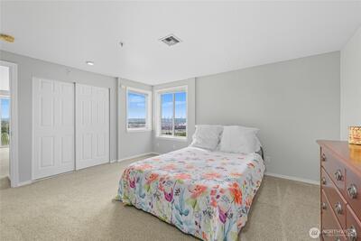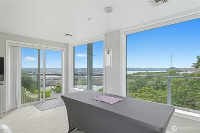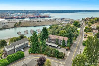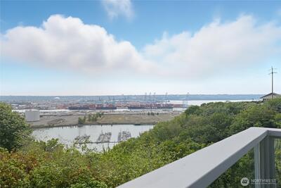 **VIEW PROPERTY** Panoramic views & modern comfort! Perched atop a bluff overlooking Port of Tacoma and Commencement Bay, This 2-bed, 1.75-bath home enjoys birds-eye views from every room. Light and bright open living space with updated kitchen featuring granite counters, tile backsplash, stainless steel appliances and custom sliding shelving. Large master suite with adjoining bath. New water heater in 2022 and washer/dryer in 2023. 2 parking spaces, 1 covered, plus storage unit. Elevator access. HOA covers water, sewer, garbage . Rental cap not currently met. This is a unique opportunity to enjoy a luxury lifestyle at an affordable price!