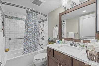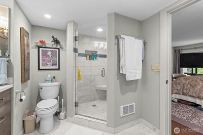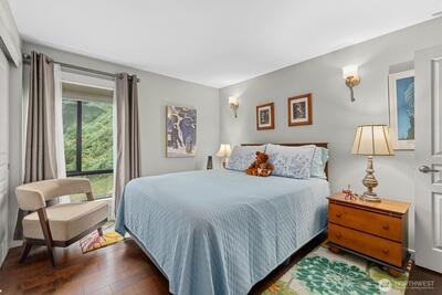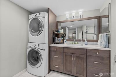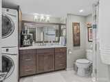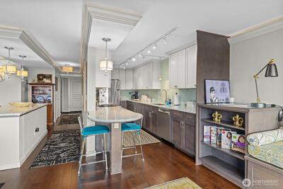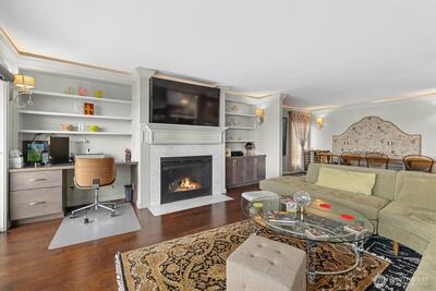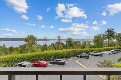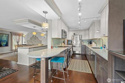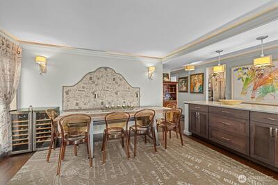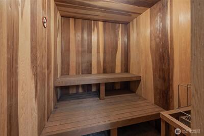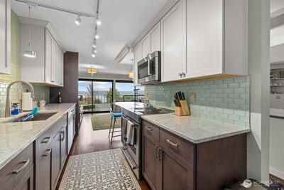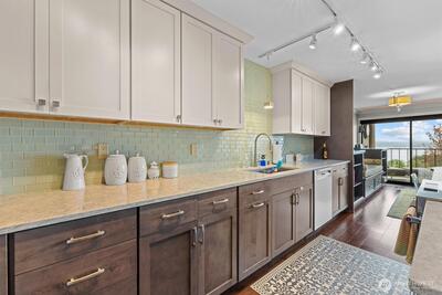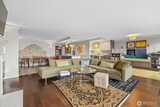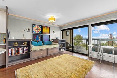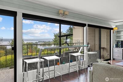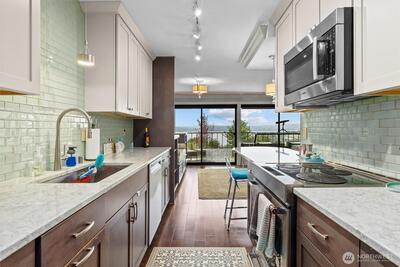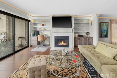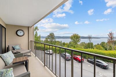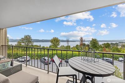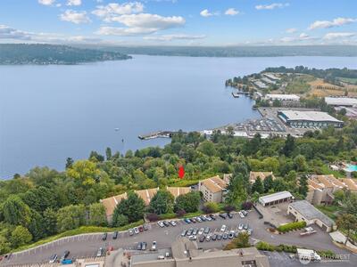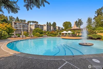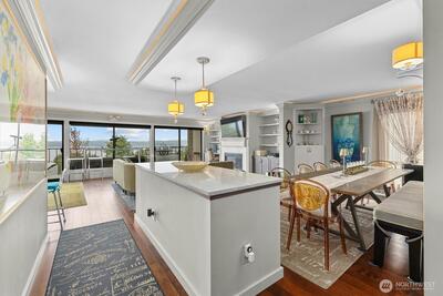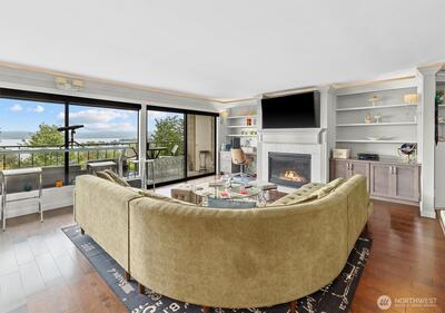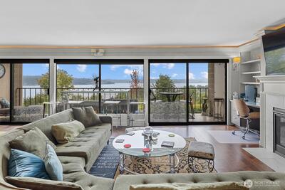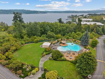 This beautifully renovated corner unit offers one-level living with stunning Lake Washington and Cascade Mountain views. The spacious interior features a lavish living room with floor-to-ceiling windows framing the lake, with a cozy fireplace and high-end lighting throughout, creating an inviting space perfect for dining and entertaining. The modern kitchen boasts sleek quartz countertops, stylish backsplash, complemented by a unique crystal bar that overlooks the large covered deck. Enjoy access to an executive gym, a spa-like swimming pool with a fountain, a sauna, electric car charger, access to the Burke Gilman Trail, and the Sand Point Country Club with driving range and tennis courts, all set within a beautifully manicured community.