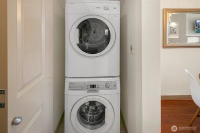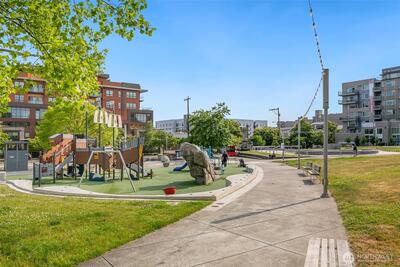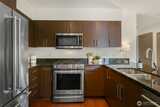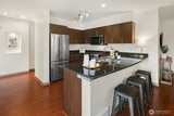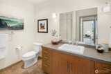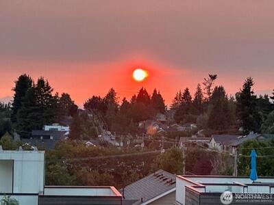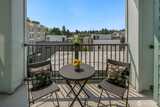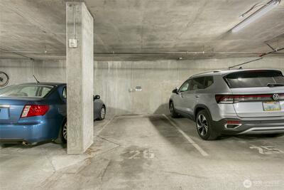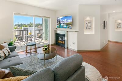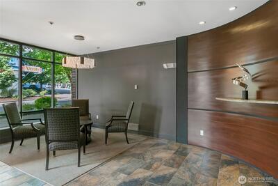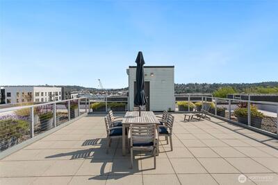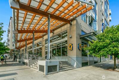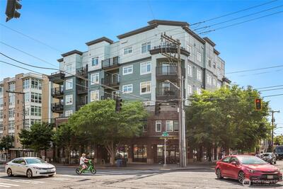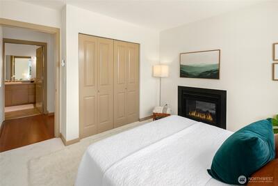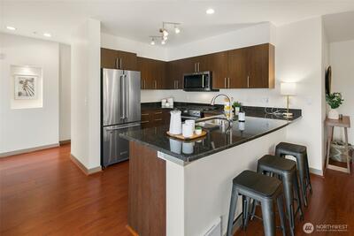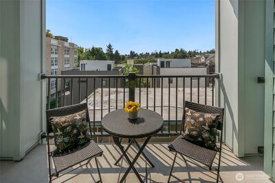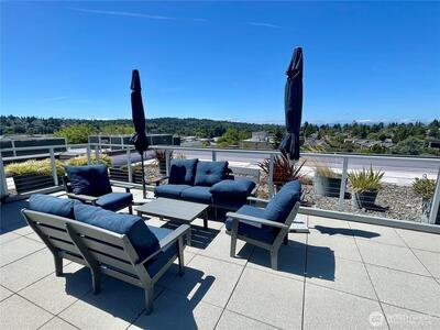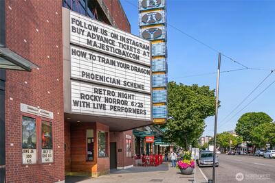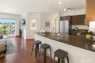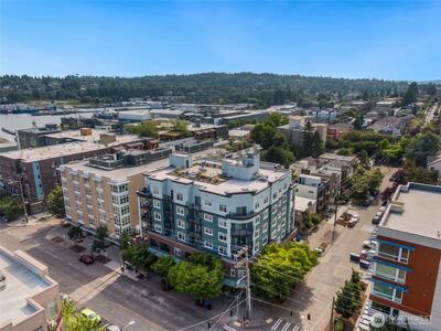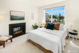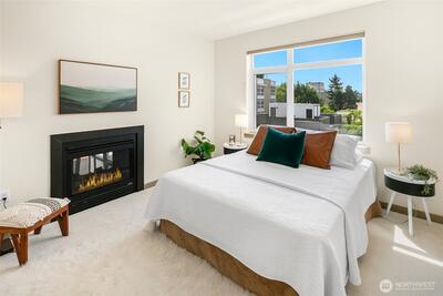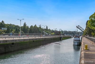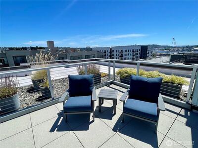 The Metropole is an impressive, boutique bldg of only 31 units, 90% owner-occupied, and it shows! Unit 45 is on the quiet-western side w/sunset & mountain views from every room; generous size deck off lvg room. Fresh interior paint, hardwds in living area, plus a rare double-sided gas fireplace in the living rm & king-sized bedroom-new carpet. Kitchen w/granite counters, gas range, abundance of cabinets & breakfast bar. A floor plan w/ sharp architectural details & character, like no other. Professionally mngd HOA, rental cap, deep reserves, no assmnts & long term ownership. Separate floor for storage;secure garage w/EV charging. Expansive rooftop deck worth using. All within blocks to Ballard's finest! Great value for this high end condo!