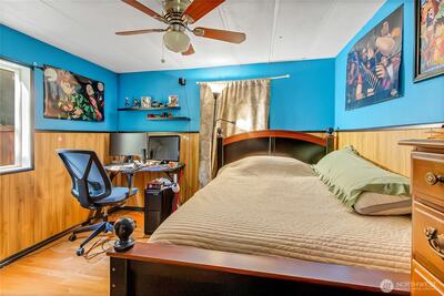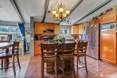 Affordable living in ALL-AGES Shiloh Park! This 3-bed, 2-bath, 1,404 sq ft home sits on a rare .29-acre leased lot with mature landscaping, fruit trees, and great parking. Enjoy a refreshed kitchen with an island, granite tile counters, updated cabinets, tile backsplash, and modern appliances—all included! Stay comfortable year-round with a cozy wood stove and efficient mini-split for heat and A/C. Relax on the covered back deck and appreciate the fully fenced back yard which has a hot tub, greenhouse, fish pond, two storage sheds and even comes with firewood. The roof, gutters, and siding were replaced in 2014. Shiloh Park is an all-ages community with spacious lots and affordable space rent. Don’t miss this opportunity!