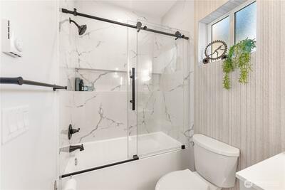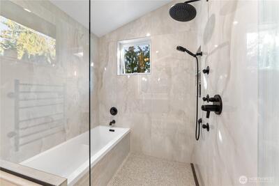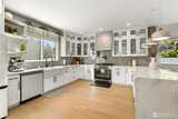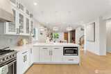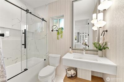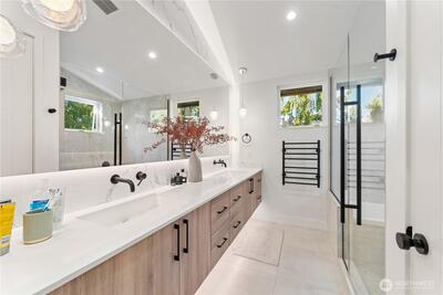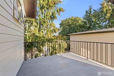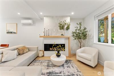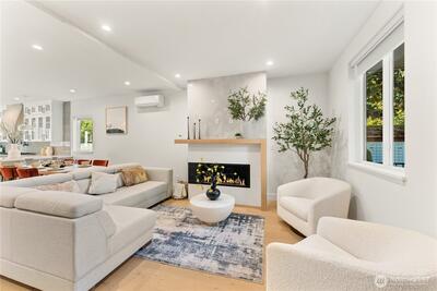 Better than new construction on a peaceful Phinney Ridge street. Owner/builder meticulously rebuilt this house in 2023 as his own house. High end thoughtful touches throughout: high ceilings on main and upper floors (most bedroom doors are 8'), gorgeous engineered hardwoods on both levels, even the stairs. Stunning great room features living rm with gas fireplace, large dining area, & total chef's kitchen with quartz counters, Bertazzoni 6 burner stove/oven, pot-filler, walk-in pantry, etc. 4th BR/office on main floor. Upper floor has 3 beds, 2 full baths, including an incredible primary suite with its own covered deck. The 2 other bedrooms share a covered balcony. Efficient mini-splits for heating & cooling. Driveway parking off alley.