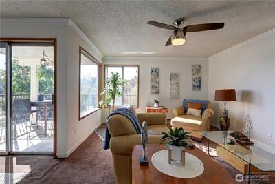 Enjoy a waterfront view from this spacious unit! Two bedrooms and 1.75 baths, with a covered balcony and an open floor plan in the living and dining rooms. Seller replaced the refrigerator, dishwasher, microwave, and cooktop range. The primary bedroom features a 3/4 bath, ceiling fan, and walk-in closet. The building has a secured community entry with two assigned parking spaces in the secured garage. Access to the clubhouse and outdoor pool. There is a large rec or event space, saunas, and showers included. Close distance to the Light Rail and transit bus. Convenient location to shopping and other community amenities.The deductions for the amenities are listed in the supplement below Dues include sewer, water, and garbage.