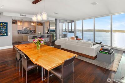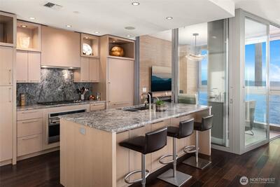 Spectacular sunsets from this 28th floor NW corner home. Views directly into Pike Place Market, Elliot Bay, Olympic Mountains, Seattle's new waterfront park and aquarium. Ferries, tugboats and seagulls. Epicurean kitchen with Wolf, Miele and Subzero. Separate pantry with extra storage. Glass room with bifold windows, large primary bedroom with ensuite spa bathroom, large toto jetted tub and shower. 2 parking spaces with EV charge ready & large storage. Coveted separate wine cellar on 2nd floor. Just steps from new Waterfront Park, Pike Place Market, Benaroya, stadiums, the arts, retail and Sculpture Park. Concierge 24/7, Two blocks to light rail, trolly and monorail. Rooftop terraces, gardens, BBQ, gym, yoga studio, boardroom, sky lounge.