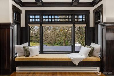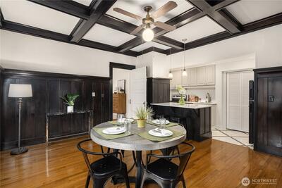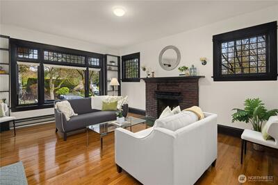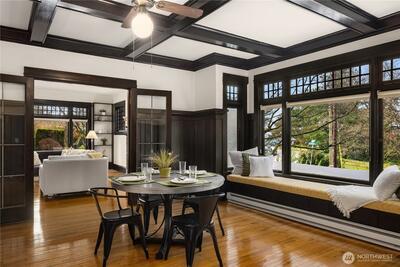 Elegant 6-unit boutique building in vibrant N. Capitol Hill. Offers covered parking, 2024 new roof & yesteryear charm. This home features a generous bedroom, sun-soaked rooms, thoughtful 2018 renovations w/so much class embracing its 1911 style:Polished hardwoods, designer kitchen w/breakfast bar, redone lighting & electrical, full bath is all upgraded & functional window bench w/storage. In-unit washer/dryer, elegant dining for large parties, box-beam ceilings, plate rail moldings & spacious living rm w/fireplace & mullioned windows. Great for commuters!Quick prox. to I-5, SLU,UW, Eastside, 520, Lake Union, medical & Seattle Hub.Pet-friendly w/extra W&D & storage in basement. Explore eclectic shops, trendy eateries & cultural attractions.