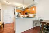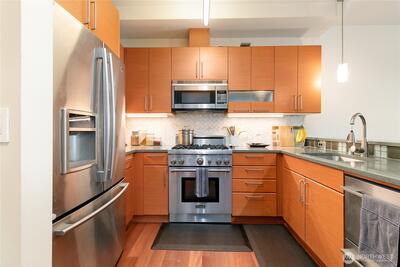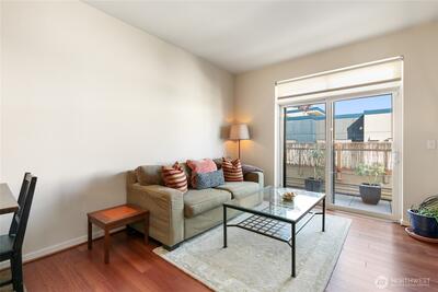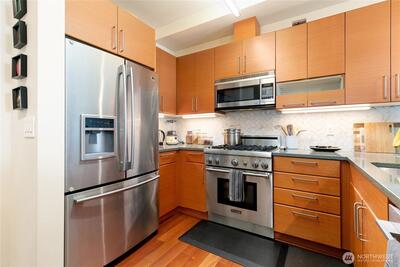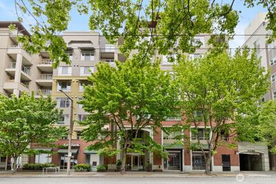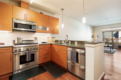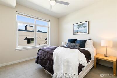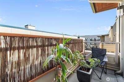 Experience the best of Ballard in this rare 1-Bedroom Penthouse at Hjarta, Ballards only concrete & steel, LEED Silver-certified condo. Similar floorpan just sold for higher; ask agent for details! This quiet, bright, modern home features open-concept living, updated kitchen with SS appliances, gas range, & breakfast bar. Private patio is perfect for morning coffee or evening relaxation. Spacious bedroom has walk-in closet & custom blinds. Full-size W/D plus central heat/AC (heat pump) add everyday comfort. Enjoy incredible building amenities: Rooftop terrace w/ panoramic views, owner’s lounge, fitness & yoga rooms, a library, & p-patches. Two secured parking spots & storage, offering ultimate convenience for city living, Ballard style!