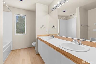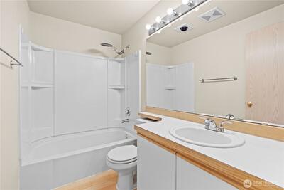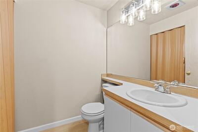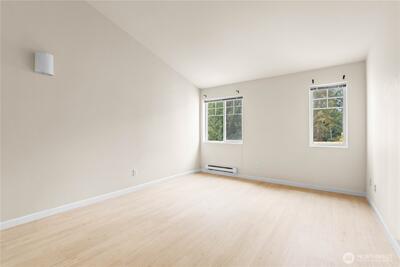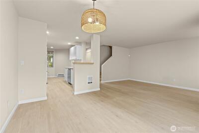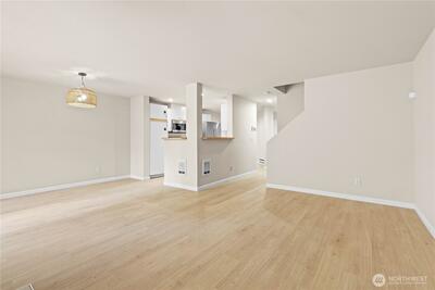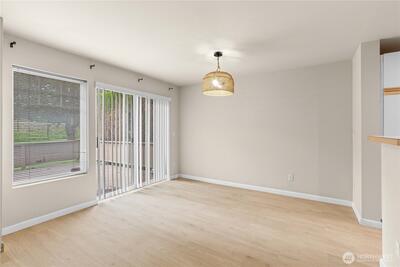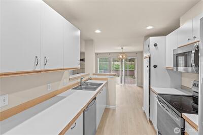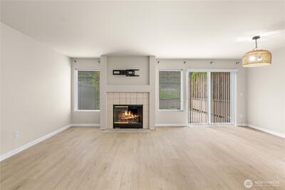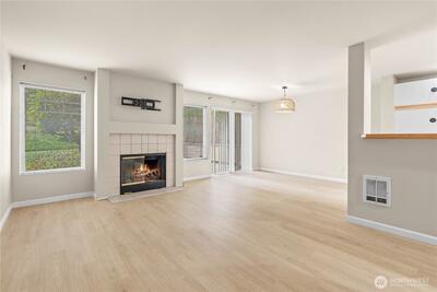 Great location townhome with private garage in the desirable Regatta Lakes development. Newer laminate hardwoods throughout and entire interior is freshly painted. Living room overlooks greenspace w/slider to your private deck. Wood fireplace keeps it cozy! Open kitchen has 2 yr old fridge and a cute little dining nook. Upstairs to the left is your primary bed with ensuite & walk-in closet. Upstairs to the right are 2 more very spacious bedrooms and a 2nd full bath. Your attached garage has room for both parking and storage! Easy access to commuting freeways, walking/biking trails, playgrounds, ball fields, golf, ice rink, and Meeker Street Urban Village & Sounder. Bonus: HOA also covers yearly chimney cleaning, plus water/sewer/garbage!