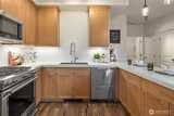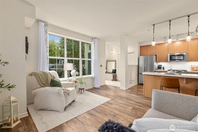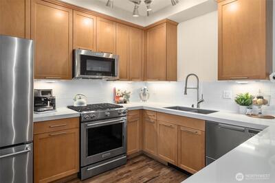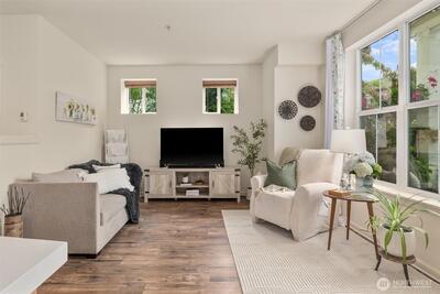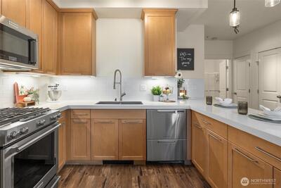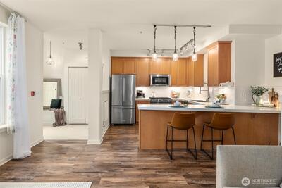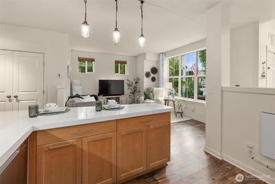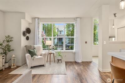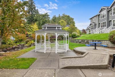 ADA-COMPLIANT condo in sought-after {ISSAQUAH HIGHLANDS} Inviting covered porch leads to a grand entry w/Tile Floors, Tall Ceilings, Sitting Bench & large Coat Closet. A natural gathering space in the cozy living rm opens directly to the updated kitchen w/custom Quartz counters, Eating Bar & Subway Tile. S/S appliances; Fridge, Gas Range/Oven, Dual-Drawer Dishwasher. New Lighting & Fresh Paint brighten the space. Laundry Closet w/new tankless H2O, while efficient radiant heating keeps the home cozy. ADA bathrm features a walk-in shower w/tiled floors & linen closet. Bedroom offers an inset window for natural light. PLUS a 1 Car Garage. Building has a NEW ROOF! Enjoy the Highlands lifestyle w/integrated trails, nearby shops, schools & parks!