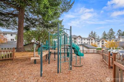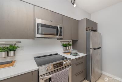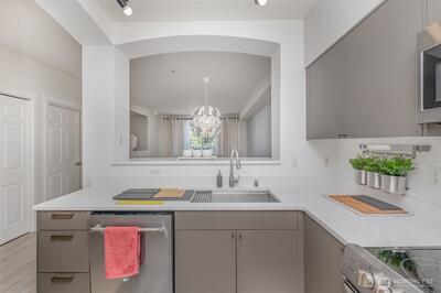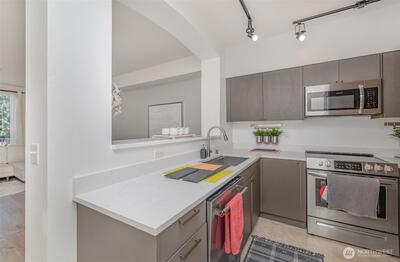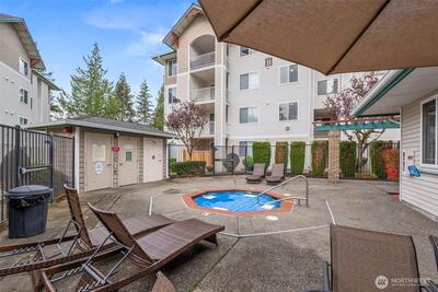 Welcome to this spacious 1-bedroom, 1-bathroom condo at ParTerra in Newcastle! With a sleek, modern feel and a great color palette throughout, this home is move-in ready. The stylish kitchen boasts stainless steel appliances, ample counter and cabinet space, and a convenient pass-through to the living room. The living area features a cozy fireplace, while the large primary bedroom offers plenty of space for a seating area, office, or extra storage. The spa-like bathroom includes dual sinks and a separate shower. Enjoy the convenience of underground parking and access to fantastic community amenities—playground, hot tub, and gym. Perfect for those seeking a serene, modern lifestyle with top-tier amenities! Furniture included in sale.