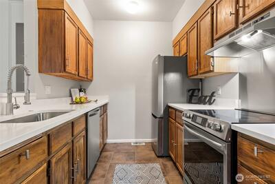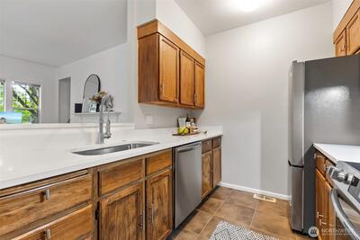 Welcome to your serene retreat for 55+ in the heart of Providence Point! This charming lower-level condo is tucked away on a quiet cul-de-sac & offers the perfect blend of comfort & convenience. Step out from your living room through elegant French doors onto a covered patio w/peaceful forest views—an ideal spot for morning coffee, gardening, or relaxing with pets. Inside, the kitchen shines w/quartz countertops, updated hardware & all brand-new SS appliances. The dining & living area is warm & inviting, featuring a cozy wood-burning fireplace for those crisp Northwest evenings. The spacious primary suite includes a walk-in closet & an updated bath w/convenient in-unit washer & dryer. Come discover the lifestyle you’ve been looking for!