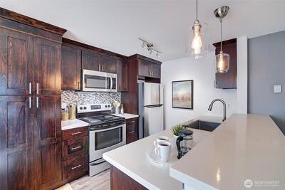 Outstanding, beautiful, spacious top-floor corner unit. Light, bright & very comfortable floor plan. Huge bedroom with lots of closet space. Gorgeous remodeled kitchen w/new whirlpool Fridge, Bosch dishwasher & microwave. New deep, stainless steel sink, quartz countertops, new pendant lighting & new flooring. Lovely updated full bath and new "in-unit" washer & dryer. New interior paint. Secure lobby entrance & dedicated parking space in the secure garage. Storage is on the garage level & guest parking on the south side of the building. Pets up to 15 lbs. are welcome. Excellent Greenwood location, close to cozy coffee shops, great restaurants & convenient shopping. Low HOA dues, no rental cap. This is truly fantastic city living!