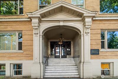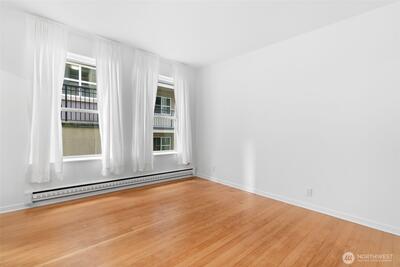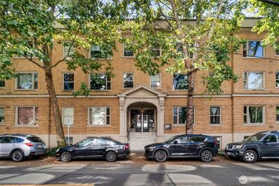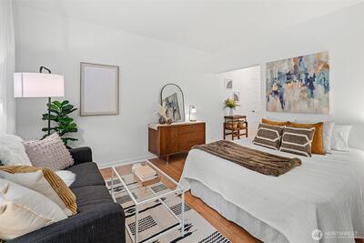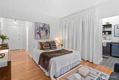 Exceptional value in desirable Lower Queen Anne/Uptown. Vibrant in-city living at the Strathmore Coop, one block to Seattle Center & Climate Pledge Arena, near SIFF Cinema. Charming studio: light-filled from oversized, south-facing windows, dramatic ceilings & refinished fir floors. Maximize living space: Murphy bed alcove, 2 walk-in closets. Kitchen w/space for dining table & chairs. Secure bldg, 100% owner occupied, bike storage, private storage locker, shared laundry. Low HOA dues incl property taxes & W/S/G. RPZ available. Great vibe: walk to Met Market, dining & cafes, easy transit to downtown & SLU. RZP parking available. Excellent in-city home or pied-à-terre. New price=unparalleled opportunity! Secure this gem before the holidays.