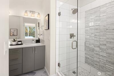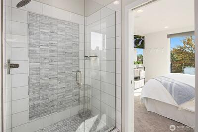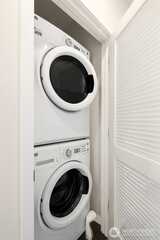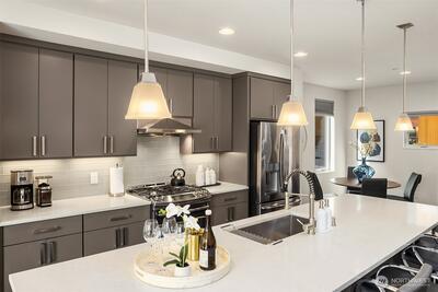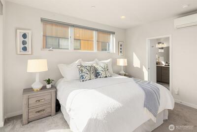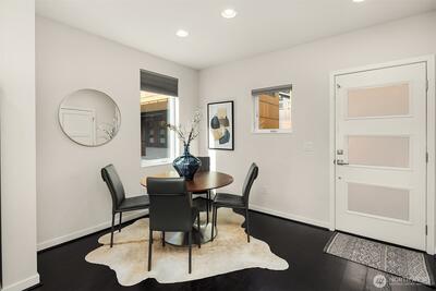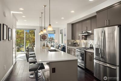 Secure and sophisticated, Two story corner unit with private entrance and secured parking. The living space is centered around a Chef's kitchen with a long quartz island and seating for 4+ guests. The dining room is open-ready for your more formal gatherings with the kitchen posed as the focal point for entertaining. Powder here is a plus! Upstairs you have 2 bedrooms and 2 bathrooms--one being the primary suite. Gracious and grand (King beds welcome) with a walk-in closet and double vanities in the marble and quartz bathroom. Your private rooftop deck provides huge views of the mountains and the colors of fall. This savvy home is located in NE Seattle with easy access to light rail, busses, Seattle Children's, & UW/ University Village!