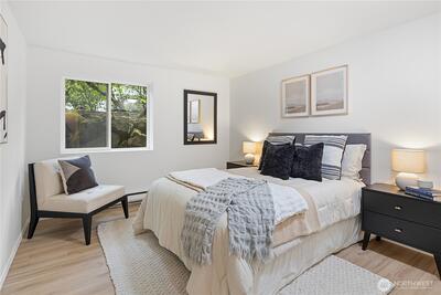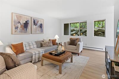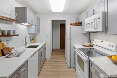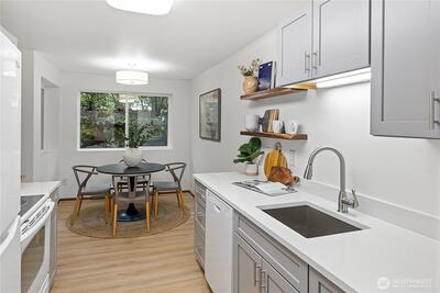 Beautifully updated one-bedroom condo in desirable Seventy-01 community. Fresh updates include a stylish kitchen with new cabinets and quartz countertops, updated bath with modern fixtures and tile surround, new flooring, paint, and lighting throughout. Enjoy the private setting with amenities—exercise room, pool, sauna, clubhouse, and bike storage. Recent property upgrades (2018) include new siding, windows, doors, and landscaping. Pet-friendly with no rental cap and on-site HOA management. Steps from the Burke-Gilman Trail, Magnuson Park, and neighborhood walking paths.