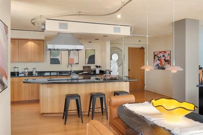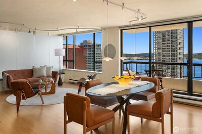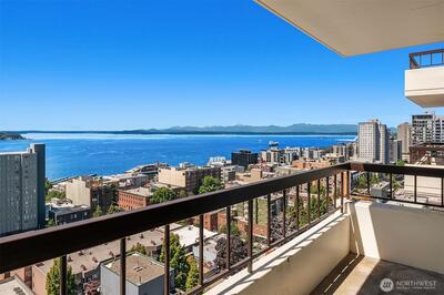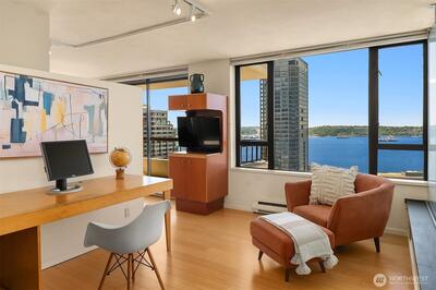 BIG PRICE ADJUSTMENT Spectacular western views of Elliott Bay, the Olympics, and downtown greet you in this beautifully remodeled 1463 sf corner unit at the Grandview in Belltown. Designed to maximize space, this architecturally unique home features gorgeous built-ins, a chef’s kitchen w/island and breakfast bar, new bamboo floors, dining area, living room, den/office, w/d, powder room and spacious primary suite Floor-to-ceiling windows w/three private balconies showcase panoramic water and city views. Enjoy top-tier amenities: indoor pool, hot tub, sauna, fitness center, rooftop deck, guest suite, BBQ area, internet. HOA dues cover ALL utilities. Pet-friendly, no rental cap, secure parking, storage, close to Seattle Center & Pike Place Mkt