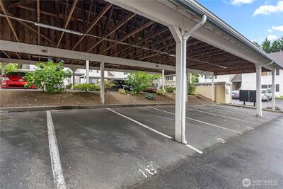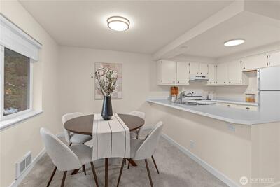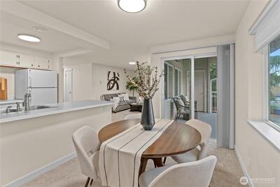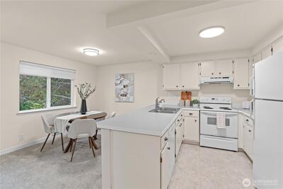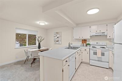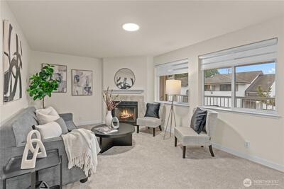 Beautifully maintained Heritage Forest condo boasts a desirable top-floor end-unit location. The inviting living area features a cozy wood-burning fireplace, perfect for relaxing. An open-concept layout seamlessly connects the living, dining, and kitchen areas—ideal for both everyday living and entertaining. A sliding glass door opens to a private covered deck with an additional storage closet. The spacious primary suite includes a walk-in closet and full bath. A versatile 2nd bedroom makes an ideal guest room or home office. Recently updated and move-in ready. Enjoy the convenience of a dedicated parking space. Prime Renton Highlands location close to parks, shopping, dining, and easy commuter access. No rental cap!