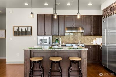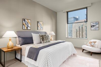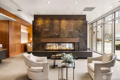 Location, location, location! This northwest-facing 2 bed + 2 bath with large den corner home on the 19th floor offers sweeping city views. Enhanced with a $100K designer upgrade package including premium finishes, built-in sound system, and luxury details throughout. Gourmet kitchen with Viking stainless appliances and granite counters, gas fireplace, central AC & heating, and a spacious balcony to enjoy the view. Primary suite with full 5-piece bath. Two parking spaces and storage included. Building amenities: 24-hour concierge, fitness center, spa, and loft lounge with chef’s kitchen. Walk to everything in the heart of DT Bellevue.