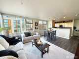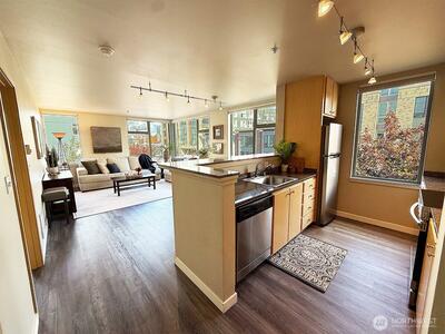 RARE CORNER 2 Bedroom/2 BATH unit! Open floor plan w/ gleaming LVP flooring in spacious dining/great rooms offering oversized corner windows w/ custom blackout blinds! Kitchen boasts SS appliances & granite counters w/ breakfast bar. Primary suite has peek-a-boo views of downtown, large walk-in closet, ensuite bath, & cozy carpets (2023). 2nd bedroom features sliding balconette. 2nd large bathroom boasts stackable washer/dryer (2024). 1 assigned parking spot in secure garage. Steps from Amazon Fresh, Seattle Fish Guys & Walgreens. Well-run HOA w/ strong reserves. Pet friendly, automated package concierge & community gym. Easy access to downtown, stadiums, freeways & Judkins light rail– early 2026 opening! Minutes from downtown, I-5 & I-90!