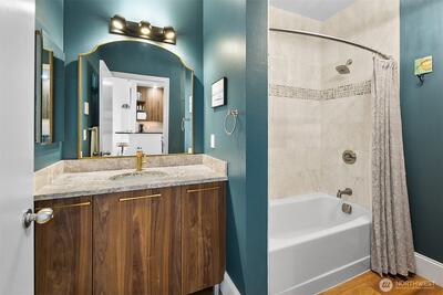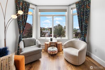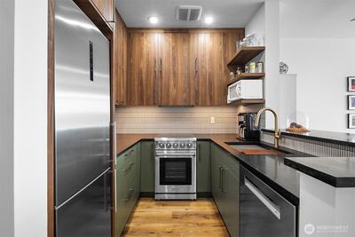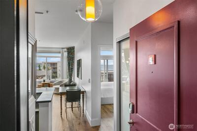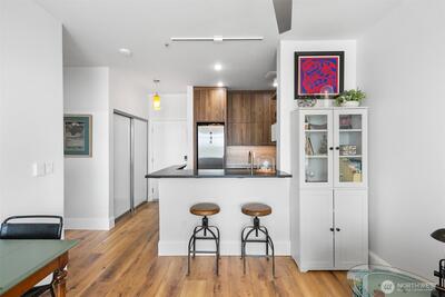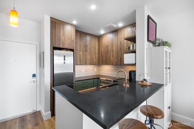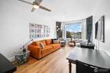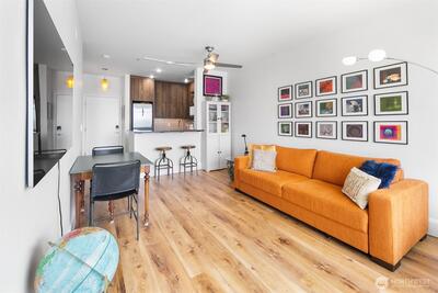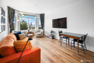 Investor Alert! High-performing Airbnb rental with transferable professional website. Remodeled west-facing Belltown condo with stunning Puget Sound & mountain views, modern design, and smart tech. Updated kitchen: granite counters, INAX tile backsplash, custom cabinets, Thor oven, open shelving & breakfast bar. Luxury vinyl plank floors, fresh paint, MYSA smart thermostats, and app-managed keyless entry. Sunny bay window for relaxing. All furnishings included with full-price offer. European washer/dryer combo, YoLink leak sensors for water heater. Resort-style amenities: Zen courtyard, rooftop deck, indoor pool/spa, gym, clubhouse, business center, 1 secured garage space & private storage. Walk to Space Needle, Pike Place & waterfront