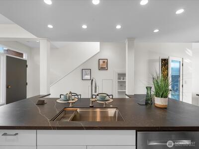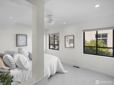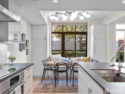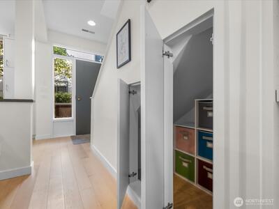 Live at Pike Place Market in this updated 2-bed, 1.5-bath Market Place North townhome. The main floor features hardwoods, a wood-burning fireplace, built-in bench & an updated kitchen with induction cooktop, quartz counters, and pantry. Upstairs, the primary suite offers a walk-in closet with custom shoe wall and a spa-like bath with dual vanities, rain shower, and Japanese Ofuro tub. The second bedroom doubles as a media room with a clever built-in “cloffice” (office in a closet). A private balcony overlooks Pike Place Market, Victor Steinbrueck Park & Elliott Bay, while upstairs adds stadium and mountain views. This rare retreat includes secure parking & storage, and is just steps from the new Market Walk and all the energy of Pike Place.