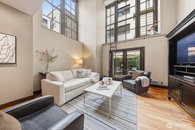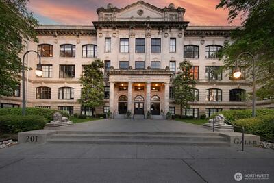 Experience the timeless charm of Queen Anne High School living. This historic landmark blends classic architecture with modern sophistication. The 1-bedroom, 1.5-bath loft-style residence spans 955 square feet, featuring soaring 20 foot ceilings and oversized windows that fill the space with natural light. The open kitchen and living area flow seamlessly to a large private patio, perfect for morning coffee or evening entertaining. Unique to this home, the unit includes its own dedicated parking space and storage. Residents also enjoy a rooftop deck with panoramic views of the city and Puget Sound, along with unmatched walkability to Queen Anne’s vibrant shops, cafes, and parks. A rare opportunity to own a piece of Seattle history.