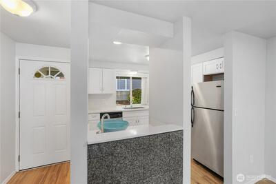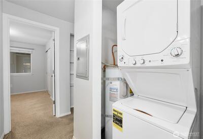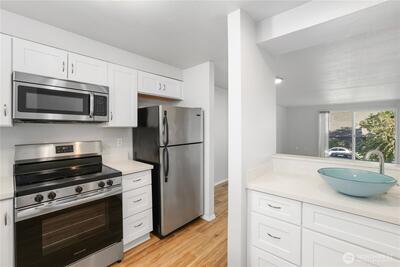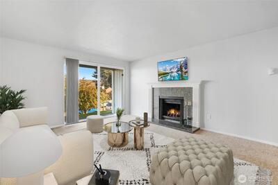 Discover easy living in this beautifully updated 2-bed, 1-bath condo in desirable North Tacoma with stunning views of Commencement Bay. This light & bright ground-floor unit features an open floor plan with newer LVP flooring & newer windows throughout. Enjoy a fully remodeled kitchen with modern finishes & all appliances included. The updated tile shower adds a fresh touch to the spacious bathroom. Cozy up by the wood-burning fireplace or take in bay views from the bedroom & patio. An in-unit washer & dryer offer everyday convenience, & a 1-year home warranty provides added peace of mind. Ideally situated near parks, dining, waterfront attractions - a prime location. Mortgage savings may be available for buyers of this listing.