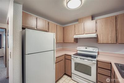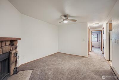 Exceptional value and prime location converge in this spacious, top-floor condo! Enjoy the peace that comes with no neighbors above you & a view of trees out your patio. Highly functional layout & a warm wood-burning fireplace. While move-in ready, this is a rare opportunity to purchase at an accessible price point and customize the interior to your exact taste and style, allowing you to build immediate equity. The condo includes 1 assigned carport parking space and ample guest parking. Pet friendly & perfectly located- you're just minutes from transit, I-405, 167, and Sea-Tac. Below the rental cap, this condo offers great potential for both homeowners and savvy investors seeking an unbeatable entry point! Welcome home.