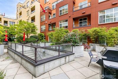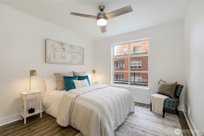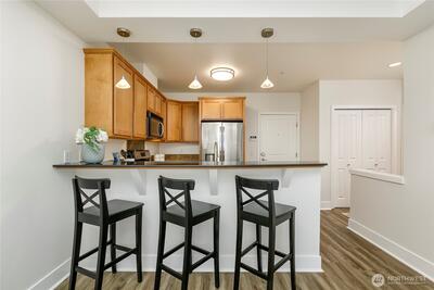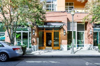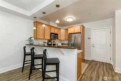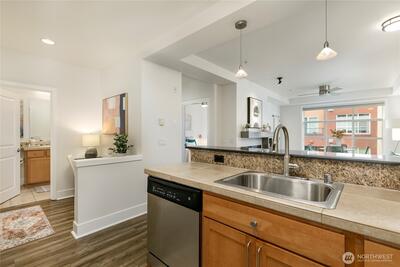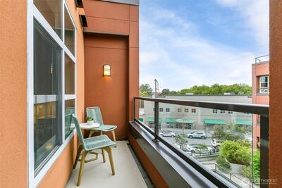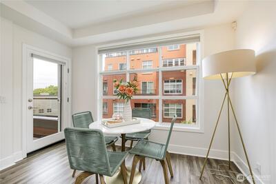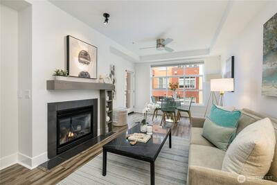 One of the most sought after areas in the city. Grab a local coffee or smoothie before your stroll around Green Lake, then the day is yours to enjoy shopping, a variety of amazing eateries, PCC, pubs, gyms, and all within steps of your front door. This chic, secure entry condo with elevator access has the perfect layout with high ceilings complimented by a wall of windows allowing in the natural light. Fresh paint, luxury plank flooring, kitchen bar seating, inviting living space with gas fireplace, huge walk-in closet, work station and a walk out deck. Extremely well run HOA with no history of special assessments. Secure garage parking and storage with owner option to purchase an EV upgrade. Convenient to I-5 & Light Rail. Pet Friendly!
