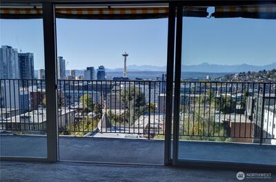 Picture Perfect View, It's the frame that needs updating!! 2Bedroom 2 Bath high-rise view condo on Capitol Hill just off Broadway. The 1042 sf unit, originally updated in 1990, is in need of cosmetic updates like new floors, paint, and bathroom improvements. Wall of picture windows showcase views of the Space Needle, Olympics, Elliot Bay, and Lake Union. Covered deck, Selling AS-IS HOA is paid through Jan, so you can watch NYE @the Needle without owing HOA fees! AVM 658K. Lamplighter Building features an 11-story structure with a pool, BBQ deck, laundry, 2 elevators, and off-street secure parking (#51). Walk everywhere! Live here and design/build your own equity while soaking in the sunset over Elliot Bay.