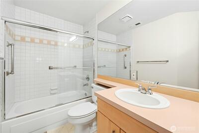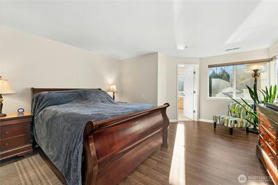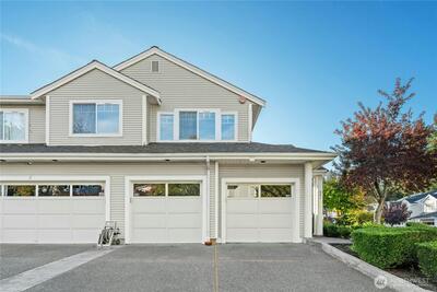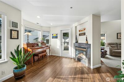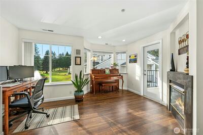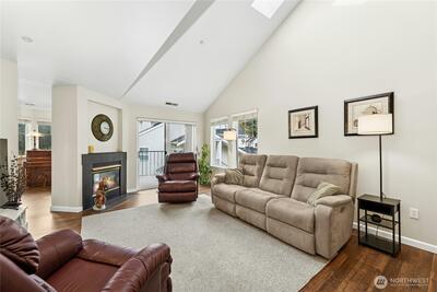 This bright and spacious 3-bed, 1.75-bath condo offers 1,676 sq ft of beautifully maintained living space. Vaulted ceilings with skylights and a cozy, double sided, gas fireplace create a warm, inviting living room. Sliders open to a private deck with peaceful fountain and golf course views. The sleek kitchen provides abundant cabinetry, and the dining area allows for formal dining. A versatile flex space off the kitchen can be used for an office or family room or informal dining . The primary suite features a dual-vanity ensuite and large walk-in closet. This desirable second-floor unit includes a welcoming front deck, 2-car garage with interior stairs, and guest parking. Convenient NE Tacoma location near I-5, parks, and local amenities.