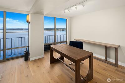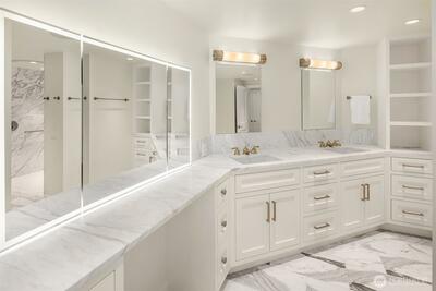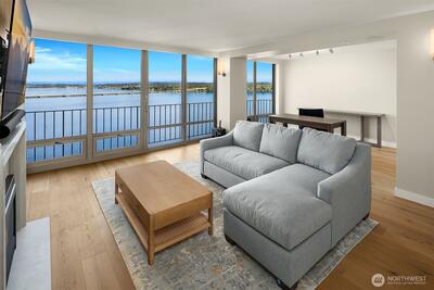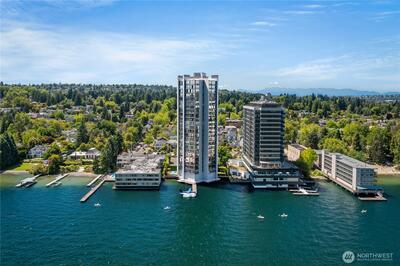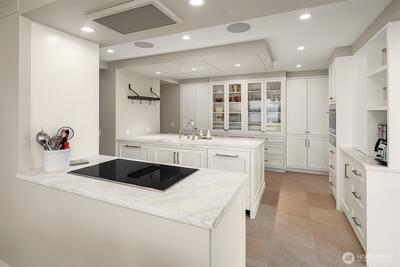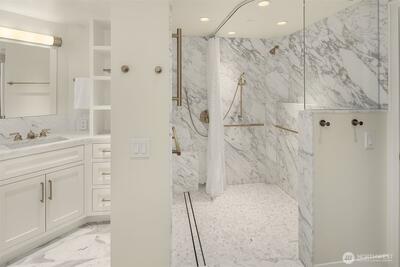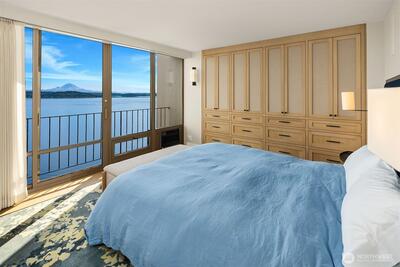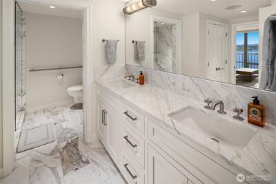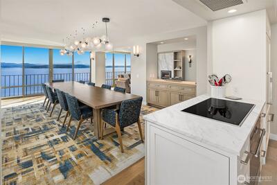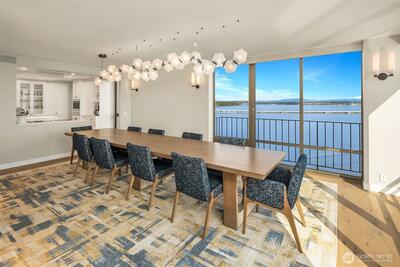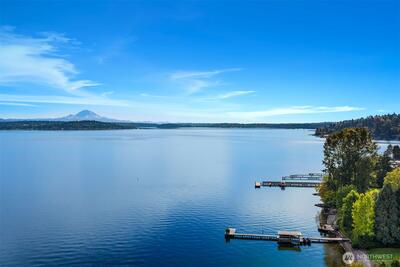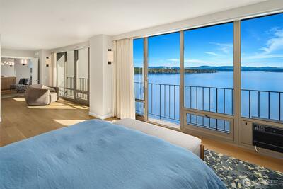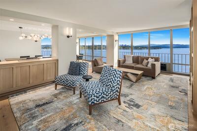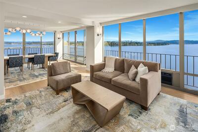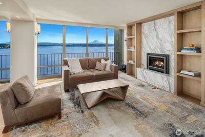 Sweeping views from Mount Baker to Mount Rainier! No expense was spared for this studs out custom remodel by Schultz-Miller in 2024 using the highest quality materials & craftsmanship. Wonderful floor plan. All the main living areas are oriented to the breathtaking views. The gourmet kitchen is a dream; custom cabinetry, slab marble counters, Sub Zero & Wolf appliances. Luxurious primary suite with sitting area & marble spa-like bath. 2nd en-suite br with a gorgeous marble bath. Custom built-ins, beautiful hardwood flooring. Lutron lighting & electric shades & blackout shades, new windows, doors, radiant floor heat, custom fixtures & A/C units throughout. The list goes on! Shared pool & dock. 2 secure pkg spaces. A truly exceptional home!