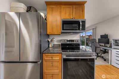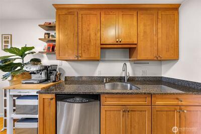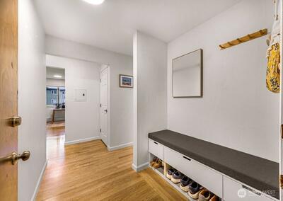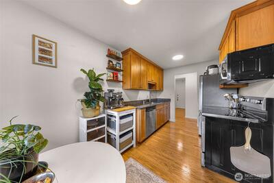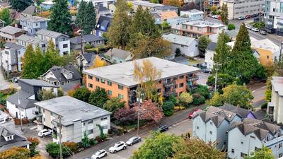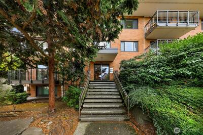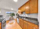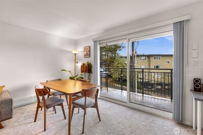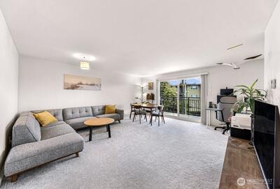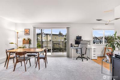 Welcome to Phinney Ridge! This quiet 1-bedroom, 1-bath top-floor end unit just steps from Green Lake offers privacy, natural light, and thoughtful updates throughout. Features include LED lighting, newer carpet, blinds, and closets, a stylish kitchen with stainless-steel appliances, a modern bath, dedicated off-street parking, private storage, and bike storage. The open layout extends to a spacious living room and large balcony with panoramic neighborhood views. Building remodels completed in 2018 with new decks, railings, windows, roof, and plumbing. With no rental cap, easy access to local restaurants, shops, PCC Market, and express transit to downtown, this unit is an excellent investment opportunity or perfect for your next home!