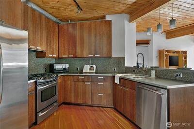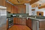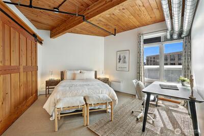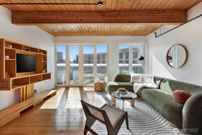 Modern finishes fashioned against an intriguing historical backdrop. Customized loft space set within a stunningly restored 1909 mercantile warehouse. Open floor plan w/every space maximized w/sliding barn doors & clever built-ins. Reclaimed fir hardwoods & exposed ceiling beams. Generous floor to ceiling windows in the living room with direct access to expansive south facing private deck w/territorial views. True one bedroom + generous closet. Garage parking space, steps away from all that Capitol Hill has to offer.