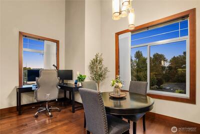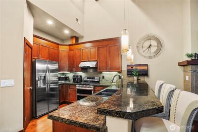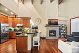 Top-floor corner penthouse unit boasting 17-foot high ceilings with exposed beams and abundant natural light! This stunning 2-bed, 2-bath condo features a chef’s kitchen with stainless steel appliances, granite countertops, plus pantry. Enjoy the warmth of the gas fireplace, beautiful cherry hardwood floors, and air conditioning for year-round comfort. The expansive primary suite offers a luxurious en-suite 5-piece bath and walk-in closet. The versatile office/flex space offers a quiet and comfortable area to work from home. Relax on your private balcony and take advantage of 2 covered parking spaces in this secure, elevator-accessible building. All this plus the convenience of an in-unit washer and dryer. This one is a must see!