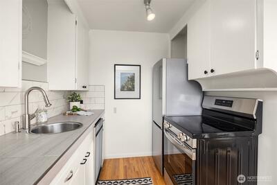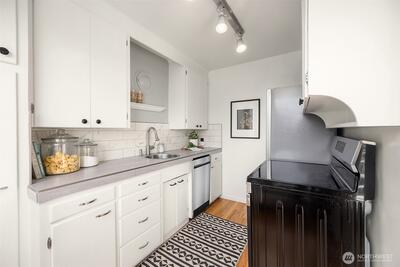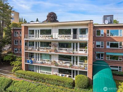 Sweeping Downtown Seattle, Mount Rainier and Elliott Bay views from this gleaming, spacious top floor Park Terrace condo in Queen Anne's coveted Uptown/Kinnear/Kerry Park neighborhood. All new paint, appliances and refinished HW floors. Enjoy morning coffee overlooking the city from your private balcony, or head up to the rooftop deck for an amazing top-of-the-world sunset barbecue. Great walkability or direct transit to parks, shopping, theaters, Climate Pledge concerts, Storm and Kraken games, downtown, the ID and the Stadiums. Park Terrace is a Seattle favorite: a well-kept, pet-friendly vintage building with lots of storage, bike parking and more. Street parking is easy with Zone 13 Parking and EV spots right in front. No rental cap!