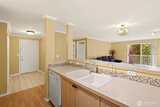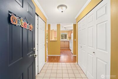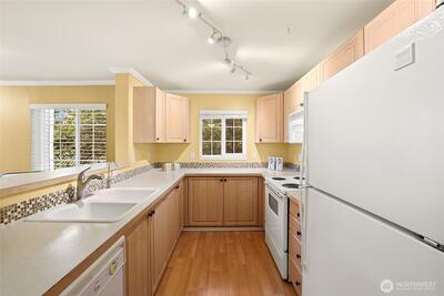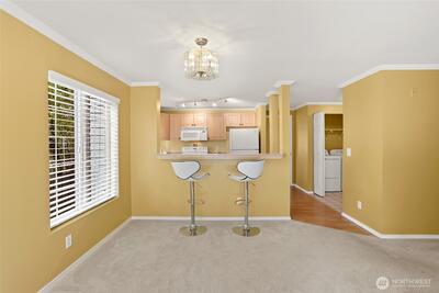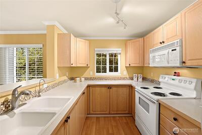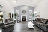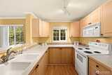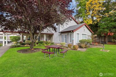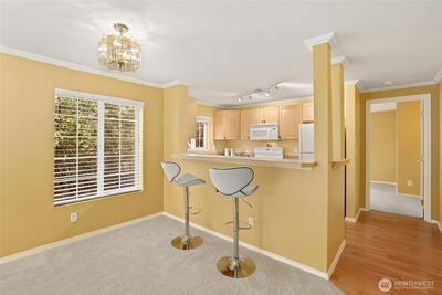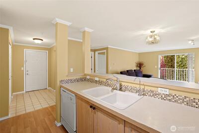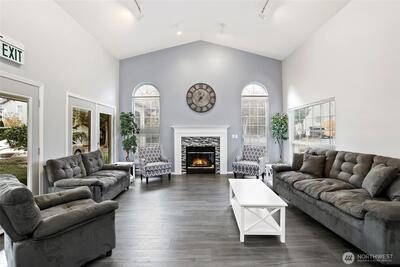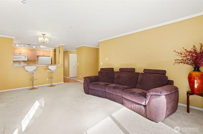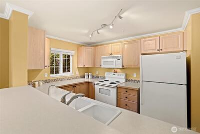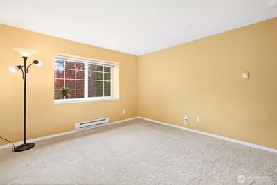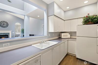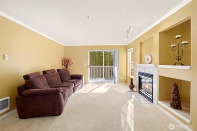 Beautifully maintained 2-bed, 2-bath end unit is bathed in natural light from the south and west. A large gas fireplace anchors the open-concept living area, with dimmers to set the perfect ambiance. Enjoy newer paint, carpet, and serene woodland views. The private balcony offers storage, plus a new high-quality water filtration system and water heater. The spacious primary suite features dual closets and an ensuite. The second bedroom overlooks the pond and fountain with dual closets. Designated carport and generous guest parking. HOA covers water, sewer, gas, and trash. Community amenities include a gym, clubhouse, and park. Walk to Trader Joe’s, dining, and more, with easy access to Lake Meridian trails, Kent Station, and Hwys 18 & 167.
