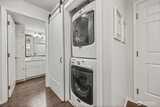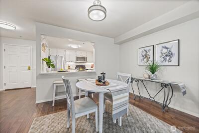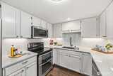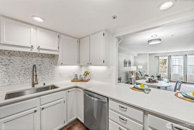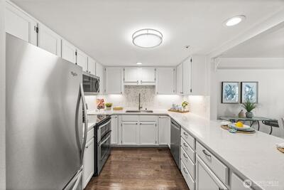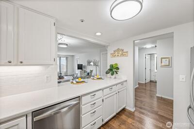 Beautifully updated and well-maintained home featuring engineered hardwood floors and an attractive kitchen with stainless steel appliances, quartz counters, subway tile backsplash, under-cabinet lighting, and a breakfast bar. Open floor plan w newer vinyl windows, interior paint, & updated lighting throughout. Enjoy custom closets & sunshades. Updated bath w quartz vanity, vessel sink, & a step-in shower w a new, attractive glass door. Front-load washer and dryer are tucked behind a stylish barn door. Private covered deck overlooking a serene community patio, plus a storage closet & 1-car garage. Set within park-like grounds in the gated 55+ Providence Point community offering resort-style amenities galore & vibrant social opportunities!