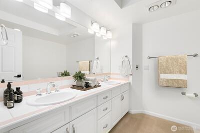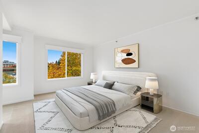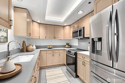 Spacious modern condo in the heart of downtown Bellevue! This light-filled 2 bed, 2 bath home features an open layout, tall ceilings, and an updated kitchen with stainless steel appliances. The second bedroom offers flexibility as a guest room or den. Enjoy a private balcony with city views and a spacious primary suite with walk-in closet and ensuite bath. Secure building with elevator, storage, and two generous parking stalls. Additional upgrade includes recirculating pump for hot water. Steps to Bellevue Square, parks, future light rail, and the Bellevue Library across the street!