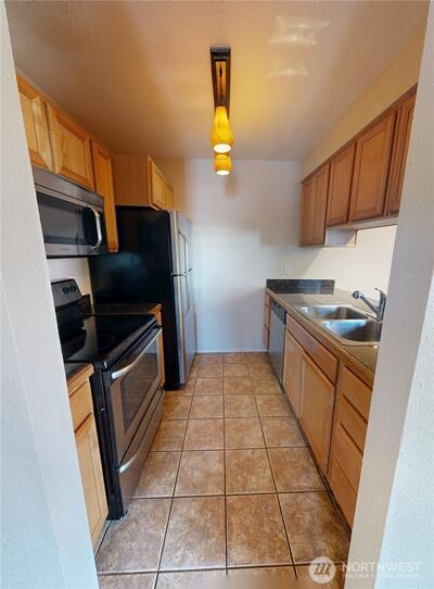 Two assigned parking spaces and two balconies at this move in ready top floor end unit filled with natural light. Open floor plan featuring warm wood flooring and a charming stone fireplace. Large windows allow ample natural light and views of the surrounding greenery. Updated kitchen with stainless steel appliances and granite countertops. The breakfast bar separates the kitchen from the dining room. Large laundry room and plenty of storage. Prime location near Lake WA, The Landing, Newcastle Commons, shopping, dining & easy freeway access to Bellevue & Seattle. Two assigned parking spots. No rental cap. HOA dues cover water, sewer, and garbage.