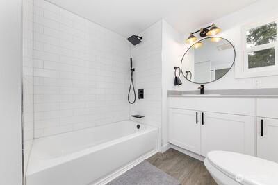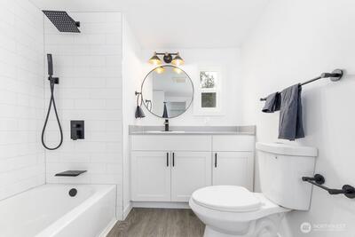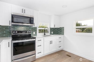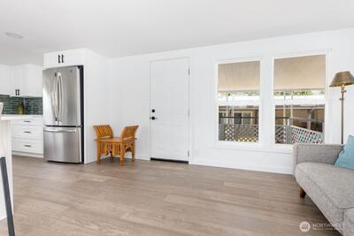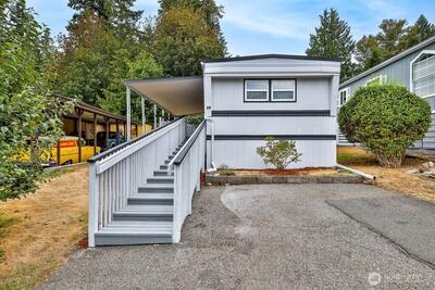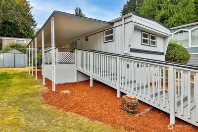 Beautifully renovated 2-bed, 1-bath home in Bothell! Enjoy a brand-new kitchen with quartz countertops, peninsula seating, stainless steel appliances (fridge, stove, microwave, dishwasher) plus a stackable washer & dryer. Pioneer soft-close cabinets, new vanity, and new shower add modern style. Fresh drywall, vinyl windows, luxury vinyl flooring, and plush bedroom carpet throughout. Relax on the covered porch overlooking a manicured yard, with added storage shed and easy-access stairs. Quiet location with no street noise, yet close to everything Bothell has to offer. Move-in ready with upgrades inside and out!