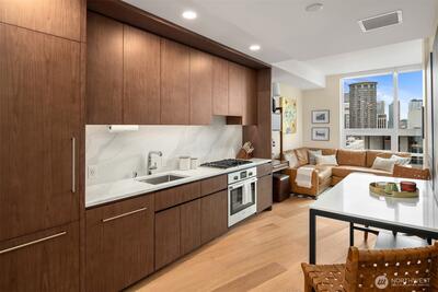 Fully furnished and turnkey, this stylish one-bedroom residence at The Emerald offers effortless in-city living just one block from Pike Place Market and steps from the revitalized waterfront. Perched on the 16th floor, it showcases sweeping city views through floor-to-ceiling windows. Designed for modern comfort, it features engineered hardwood floors, a sleek kitchen, in-unit washer/dryer, and central A/C. Enjoy premier amenities including 24-hour concierge, high-speed internet, fitness center, pet relief and grooming areas, plus a spectacular rooftop deck perfect for barbecuing, entertaining, or soaking in the Seattle skyline. A refined, low-maintenance city retreat in the heart of downtown.