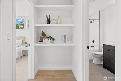 Brimming with natural light, this stunning new construction home blends modern design with exceptional craftsmanship throughout. The gourmet kitchen impresses with premium stainless-steel appliances, a quartz waterfall island, custom cabinetry, and a convenient butler’s pantry. The serene primary suite features a spacious walk-in closet with custom built-in organization and a spa-inspired bath with a freestanding soaking tub, dual vanities, and designer tile. Multiple spaces invite relaxation and entertainment, from the versatile lower-level bonus room (perfect for a media lounge, home gym, or guest retreat) to the expansive rooftop deck offering a private outdoor oasis surrounded by treetop views. EV-ready garage for added convenience.