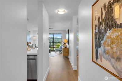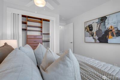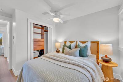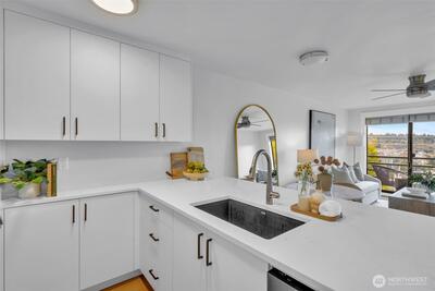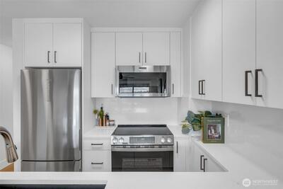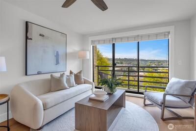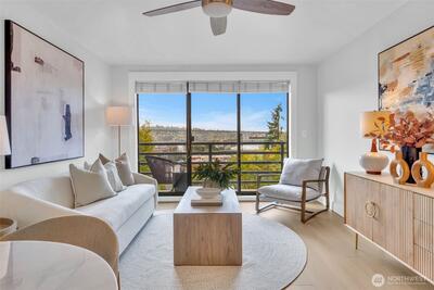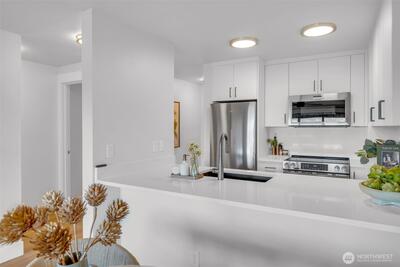 Completely renovated light-filled top-floor Wallingford condo with captivating views of the ship canal, Fremont Bridge and Olympic Mountains. This move-in ready home features modern finishes, LVP floors and an open layout that flows to a private west-facing deck. The brand new kitchen boasts quartz counters, custom cabinetry, breakfast bar and stainless appliances. Two spacious bedrooms with custom closet built-ins and a full bath complete the interior, along with in-unit laundry. Enjoy two garage parking spaces, two storage units, secure entry with lobby and a shared rooftop deck. Minutes to Gas Works, Lake Union, Fremont and the Burke-Gilman Trail, with easy access to UW and downtown. No rental cap - your city oasis awaits.