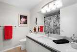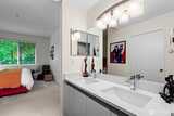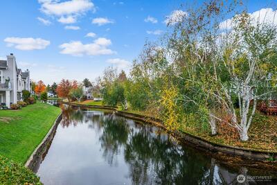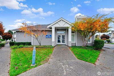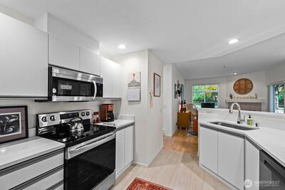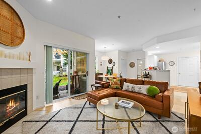 Stunning garden level end unit with covered patio, high ceilings, hardwoods, open dining & living room with wood burning fireplace. Professional remodel in 2024 includes kitchen and baths with quartz counters, ceramic tile floors, all new appliances including full size washer & dryer, carpet in both bedrooms. Spacious primary with walk-in closet, new tiled walk-in shower, floors. New wood slat blinds, new heaters, freshly painted throughout Garage parking plus extra parking in driveway. Guest parking, clubhouse w/gym, sauna & party room, walking & biking trails, beautiful water features & wildlife viewing. Wonderful community & location. Easy access to I5 N. & S. VETERANS can assume 5.75% 30 yr. fixed VA mortgage easily! A rare opportunity!
