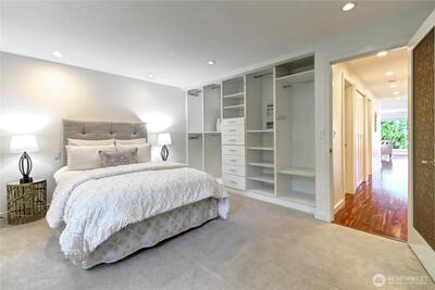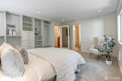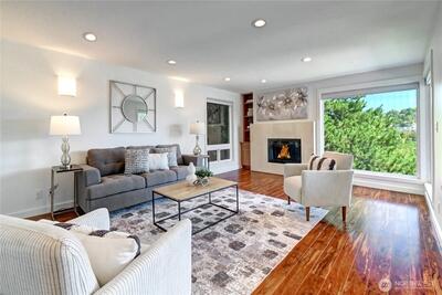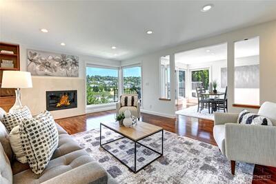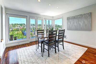 Experience modern Magnolia living in this stylish corner unit filled with tons of natural light and sweeping views of Mt. Rainier, Interbay, Queen Anne, & peekaboo views of the Sound. The open layout features a spacious living room with wood-burning fireplace, sleek cherry floors, and a dining area that opens to a private covered deck-ideal for relaxing or entertaining year-round. The kitchen flows effortlessly into the dining room-perfect for gatherings. Relax in the serene primary suite with ensuite bath and custom built-ins. A versatile second bedroom/den also includes custom storage and desk. Enjoy in-unit laundry, covered parking, and unbeatable access to restaurants, shops, the Elliott Bay Trail, and minutes to DT Seattle.
