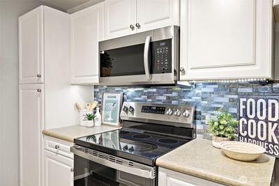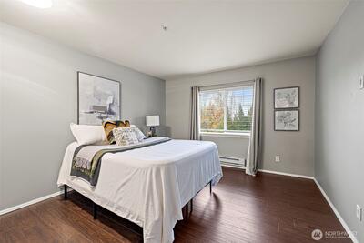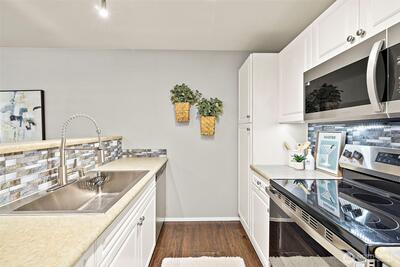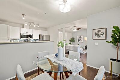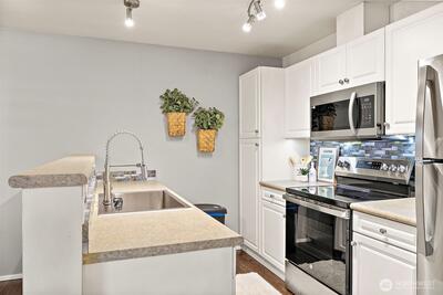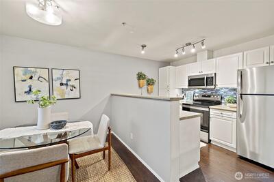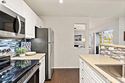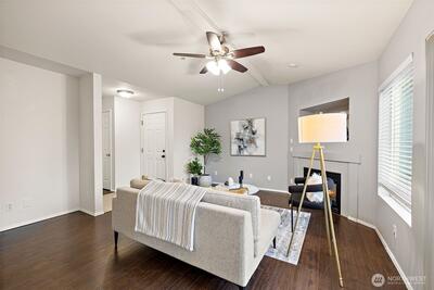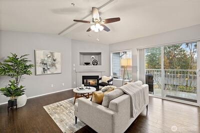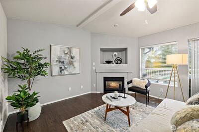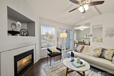 Welcome to Sunrise at Benson, a gated condo community in Kent. This inviting 2-bedroom, 1-bath home features well-designed living space with a cozy gas fireplace. Enjoy your private deck with serene tree views and an updated kitchen with white cabinets and a breakfast bar—ideal for casual dining or entertaining. Includes a private detached 1-car garage plus ample guest parking. HOA dues cover water, sewer, garbage, and common area maintenance. FHA approved with no rental cap. Conveniently located near SR-515, shopping, dining, and public transit. Don’t miss it!